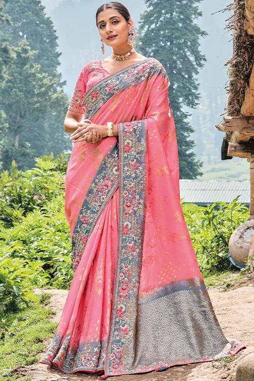 Light-Pink Dola Silk Heavy Embroidery With Khatli Work Saree.